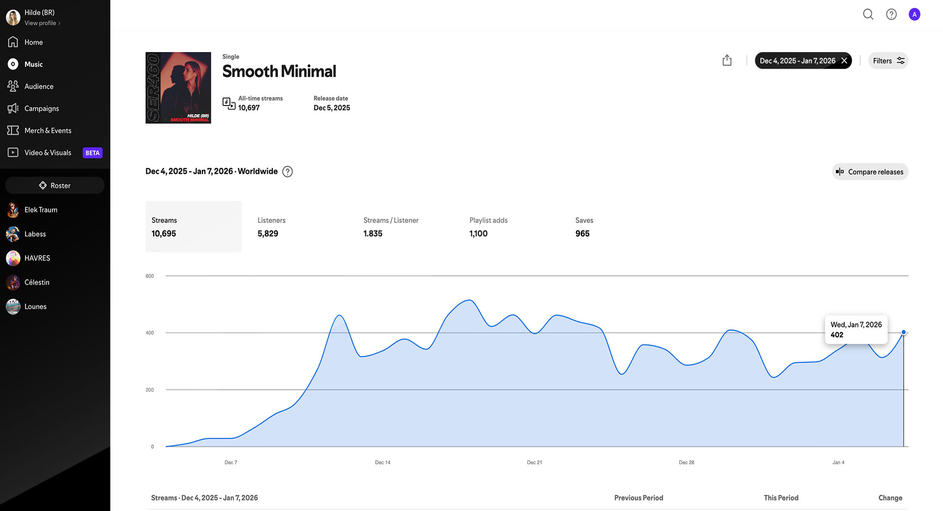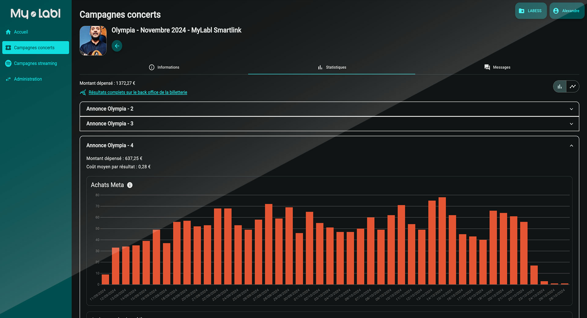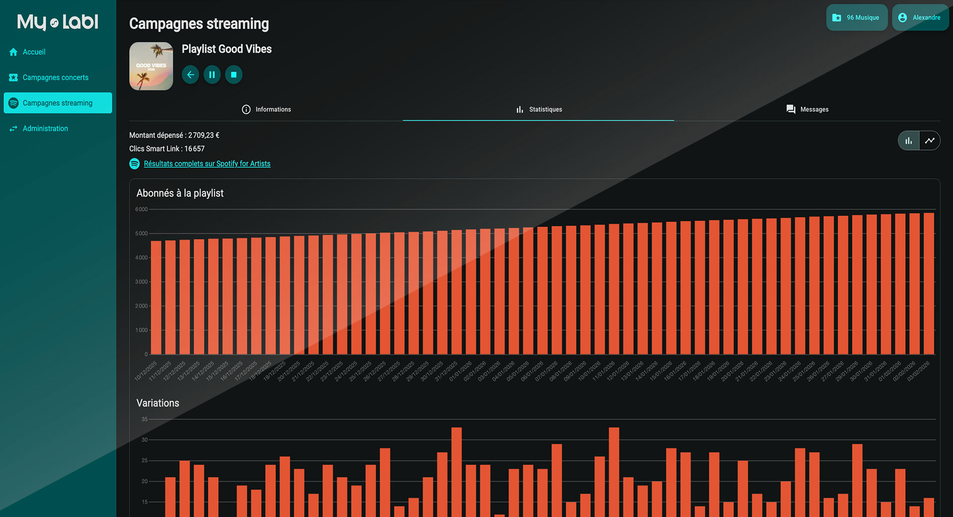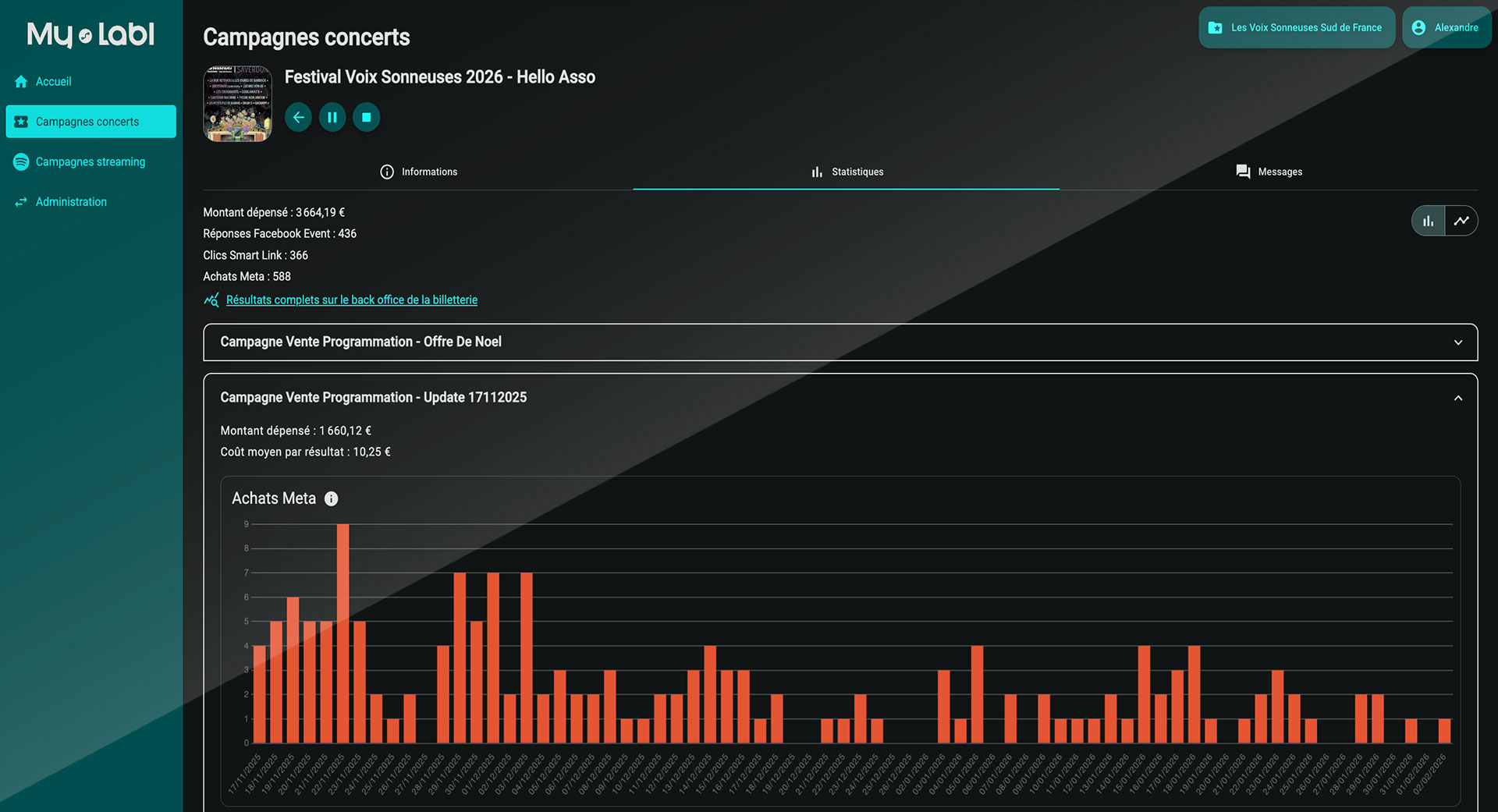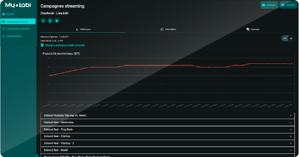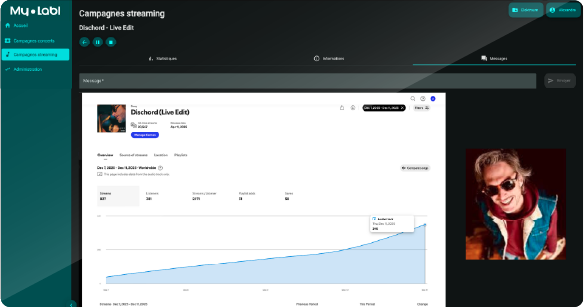 Création d’une campagne de streaming incluant 35 € de mise en place My Labl et 150 € de budget de diffusion publicitaire sur Meta.